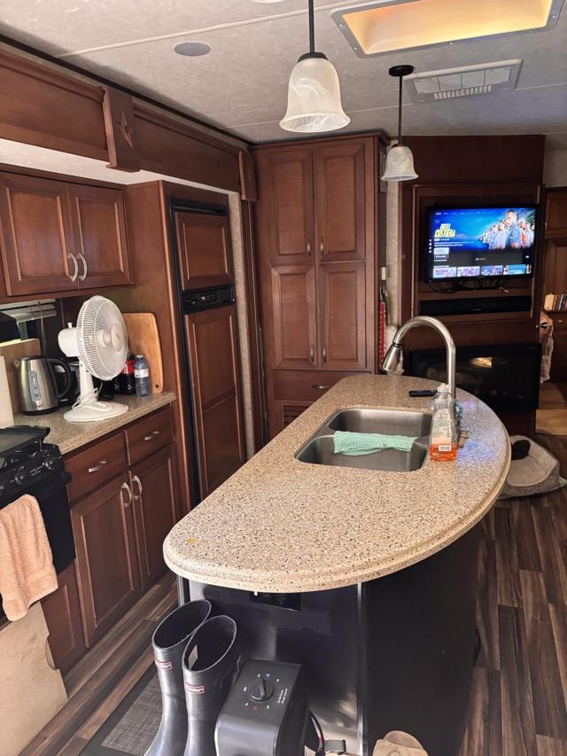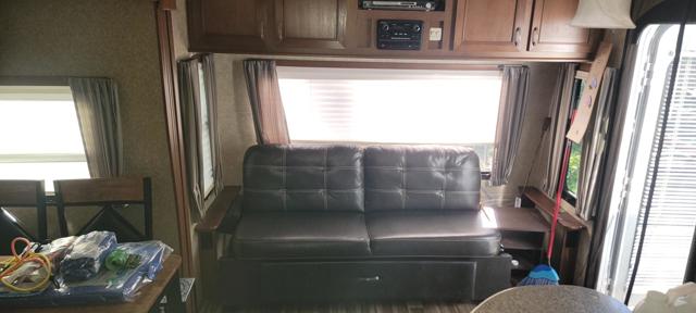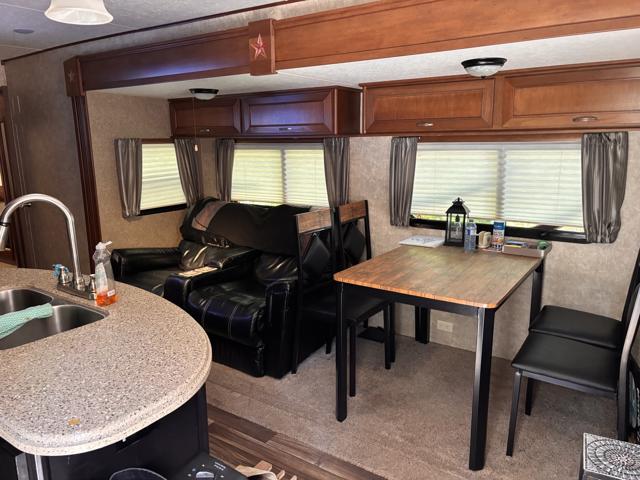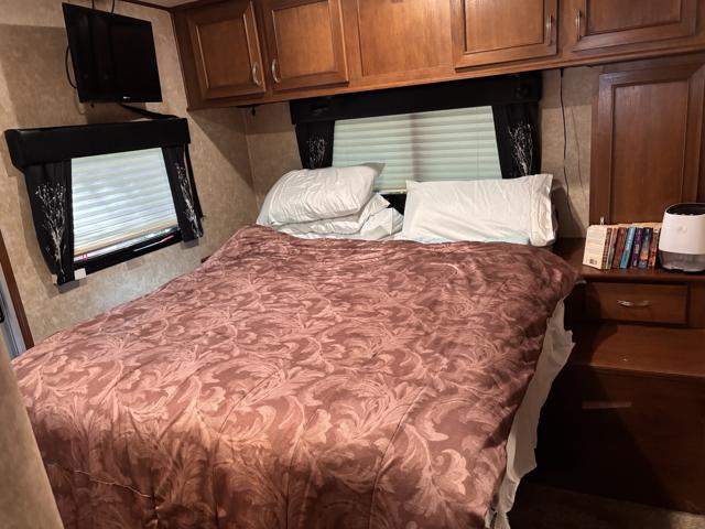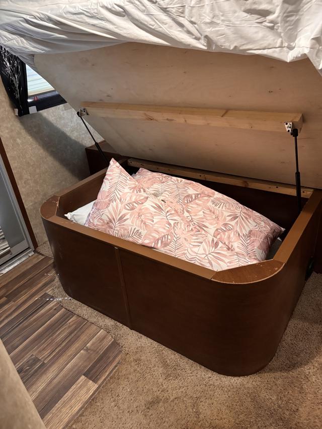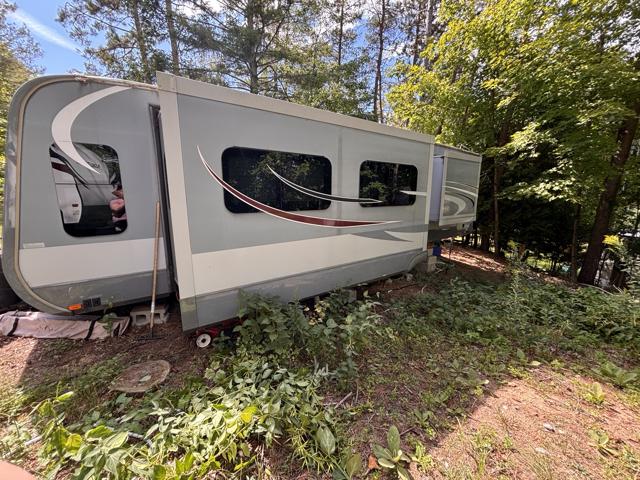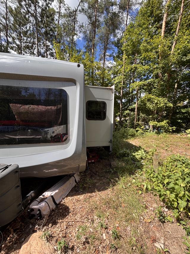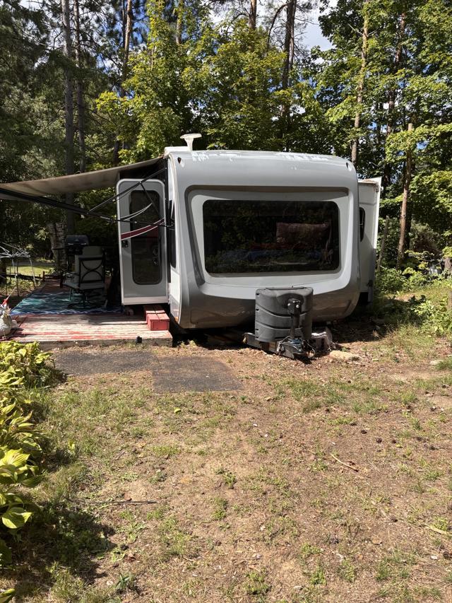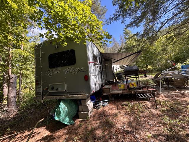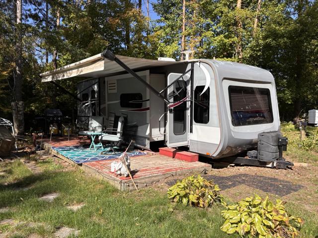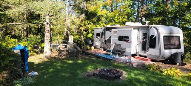 Located on a beautiful, treed seasonal site, this gorgeous couples trailer comes ready to use, complete with dishes, cutlery, pots, fireplace, lawn mower, garden tools, small deck, & BBQ.